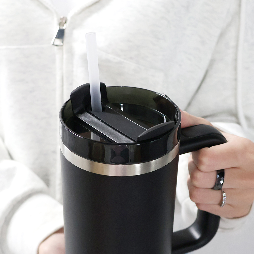 Для кружки Stayway отверстие под соломинку для питья смещено относительно центра и размещено для положения ручки в левой руке. Для положения кружки в правой руке будет удобнее использовать соломинку.